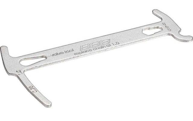 Benutzerfreundliche Kettenverschleißlehre. Wenn die Längung 0,75 = 75% erreicht, sollte die Kette bald ausgewechselt werden. Erreicht die Längung 1,0 = 100%, dann muss die Kette sorfort ausgewechselt werden. Der integrierte Kettenhaken hält die Glieder bei der Montage. Ein einzigartiges Multifunktionswerkzeug mit zusätzlichem Ventilwerkzeug und 5/6/8mm Schraubenschlüssel.