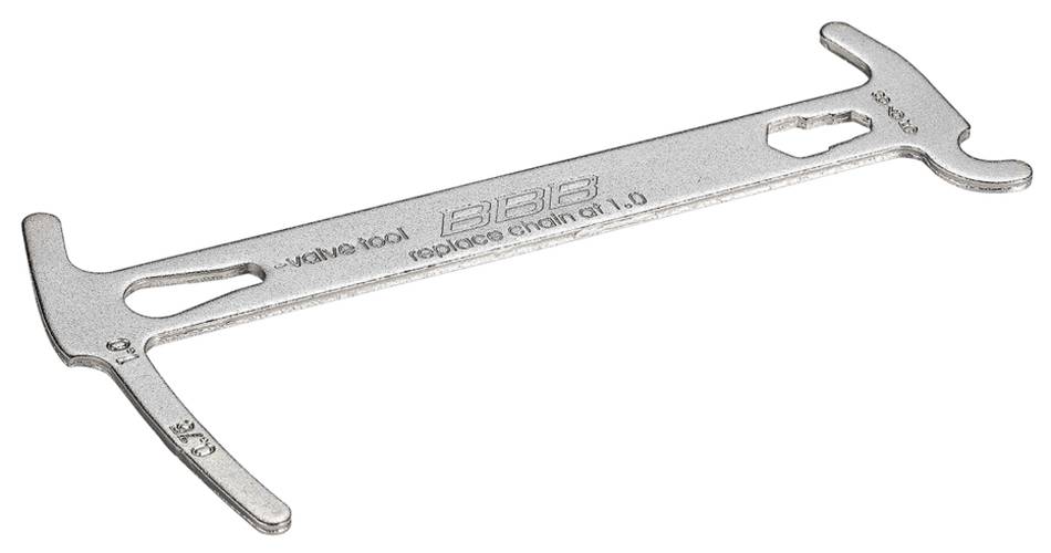 Benutzerfreundliche Kettenverschleißlehre. Wenn die Längung 0,75 = 75% erreicht, sollte die Kette bald ausgewechselt werden. Erreicht die Längung 1,0 = 100%, dann muss die Kette sorfort ausgewechselt werden. Der integrierte Kettenhaken hält die Glieder bei der Montage. Ein einzigartiges Multifunktionswerkzeug mit zusätzlichem Ventilwerkzeug und 5/6/8mm Schraubenschlüssel.