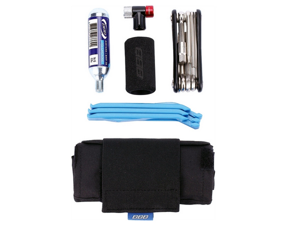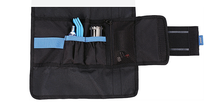 Multifunktions-Werkzeugrolle mit Platz für einen Ersatzschlauch, Werkzeuge, CO2-Kartuschen und einer Tasche für Kleinteile.